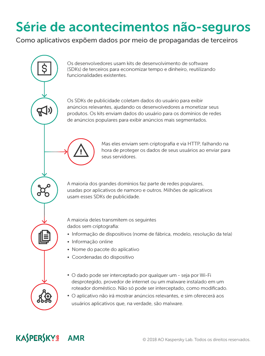 Durante aanálise de alguns aplicativos de encontros, os pesquisadores da Kaspersky Lab descobriram que alguns apps transmitem dados de usuários sem criptografia, usando um protocolo HTTP não seguro e, portanto, que corre o risco de expor seus dados. Isso acontece porque alguns aplicativos usam SDKs de publicidade de terceiros, que fazem parte das várias redes de publicidade mais populares. Os aplicativos envolvidos já foram instalados bilhões de vezes no mundo todo, e uma falha de segurança grave significa que dados particulares podem ser interceptados, modificados e usados em futuros ataques, deixando muitos usuários indefesos.