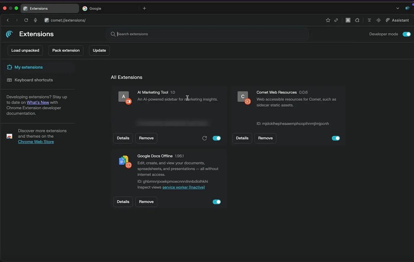 Uma lista de extensões instaladas na interface do usuário do Comet. A extensão maliciosa disfarçada, AI Marketing Tool, aparece entre elas. Fonte