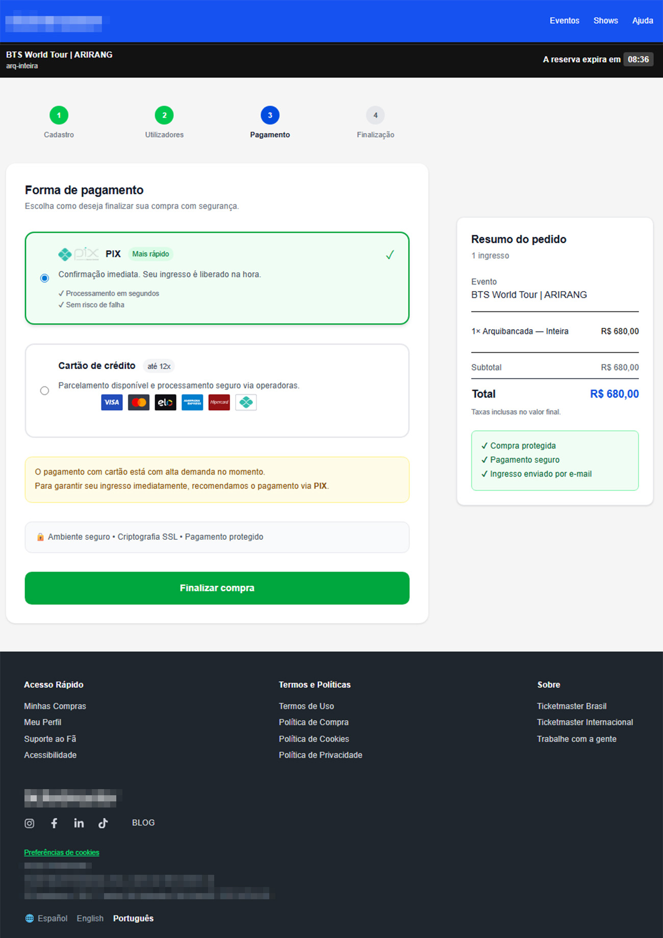 - Verifique cuidadosamente o formato de venda para cada país. No Brasil, o pagamento só deve ser feito pessoalmente, portanto, qualquer solicitação de pagamento online durante a pré-venda é um forte indício de golpe. Outros países e organizadores de eventos podem oferecer pagamentos online.