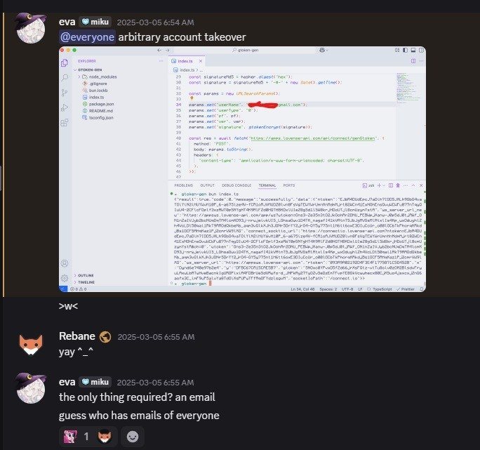 - Em 2023: os pesquisadores @Krissy e @SkeletalDemise descobriram a vulnerabilidade relacionada à invasão de contas. Lovense afirmou que a falha havia sido corrigida e pagou uma recompensa no mesmo mês. No entanto, a mensagem de acompanhamento de @Krissy informando que a vulnerabilidade ainda persistia, ficou sem resposta.