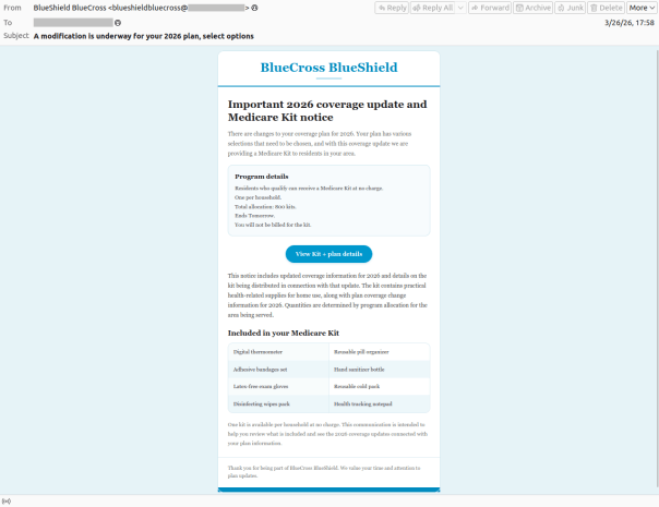 Invasores não são os únicos interessados na área da saúde já que spammers e golpistas também atuam fortemente nesse segmento. Eles oferecem “serviços médicos” com promessas boas demais para serem verdade, enviam e-mails sobre supostas mudanças no seu plano de saúde ou divulgam “tratamentos milenares do Himalaia”. Naturalmente, todos os links enviados levam a sites suspeitos, que oferecem produtos ou serviços duvidosos.
