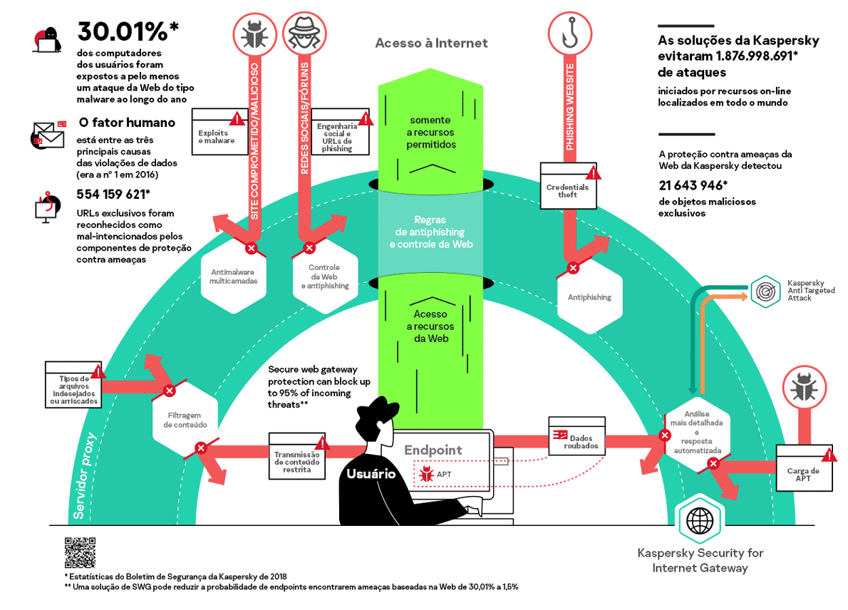 - O Kaspersky Security for Internet Gateway oferece proteção contra uma grande variedade de situações de ataques baseados na Web, como downloads de malware, ataques de execução/watering hole que usam exploits, sites de phishing que imitam recursos legítimos e muito mais. Ele também reduz o risco de infecção e vazamentos de dados limitando o acesso a categorias e recursos da Web selecionados, além de restringir a transmissão de determinados tipos de arquivo.